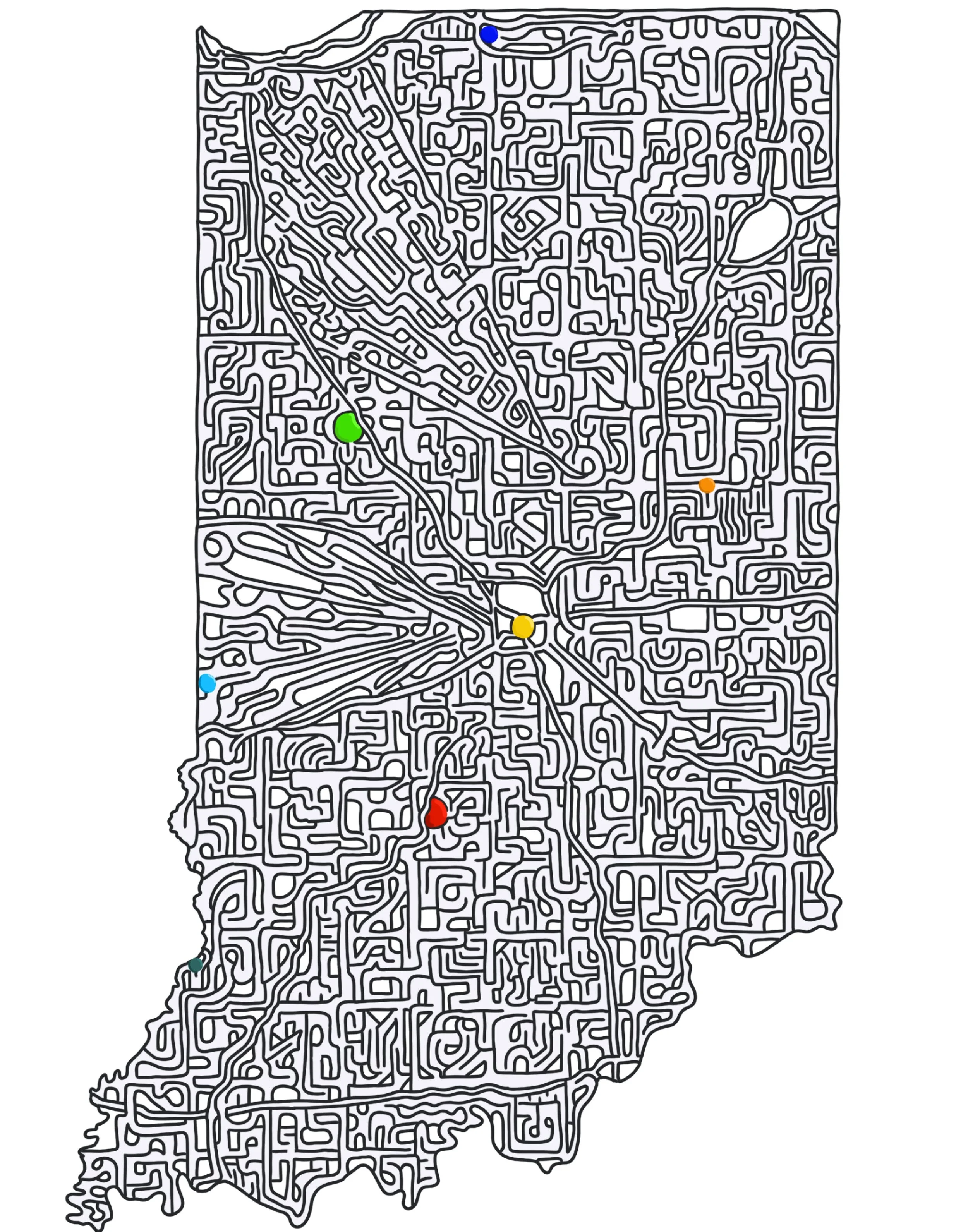 No ‘formal’ start or finish for Indiana. Instead, try to make it to each color dot! Represented is: Notre Dame (Purple), Purdue (Green), Ball State (Orange), Indianapolis schools - IUPUI, Butler, Marian, or your school of choice… (Yellow), Indiana State University (Light Blue), IU (red), and Vincennes University (Dark Teal). Sorry if I missed your school but the list of schools in Indiana is long and I’ve got to draw the line somewhere.